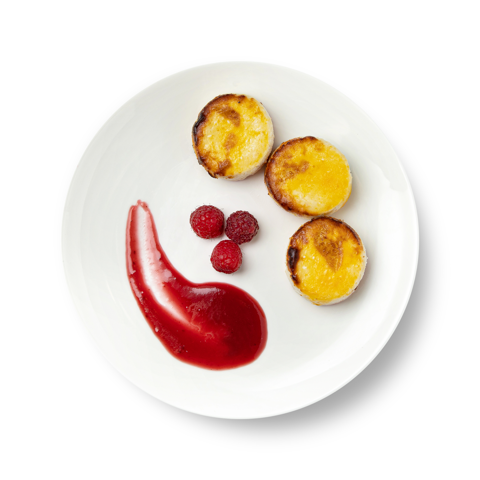 Творог, яйца, сметана, сливки, сахар, ванилин, соль, соус малиновый.
